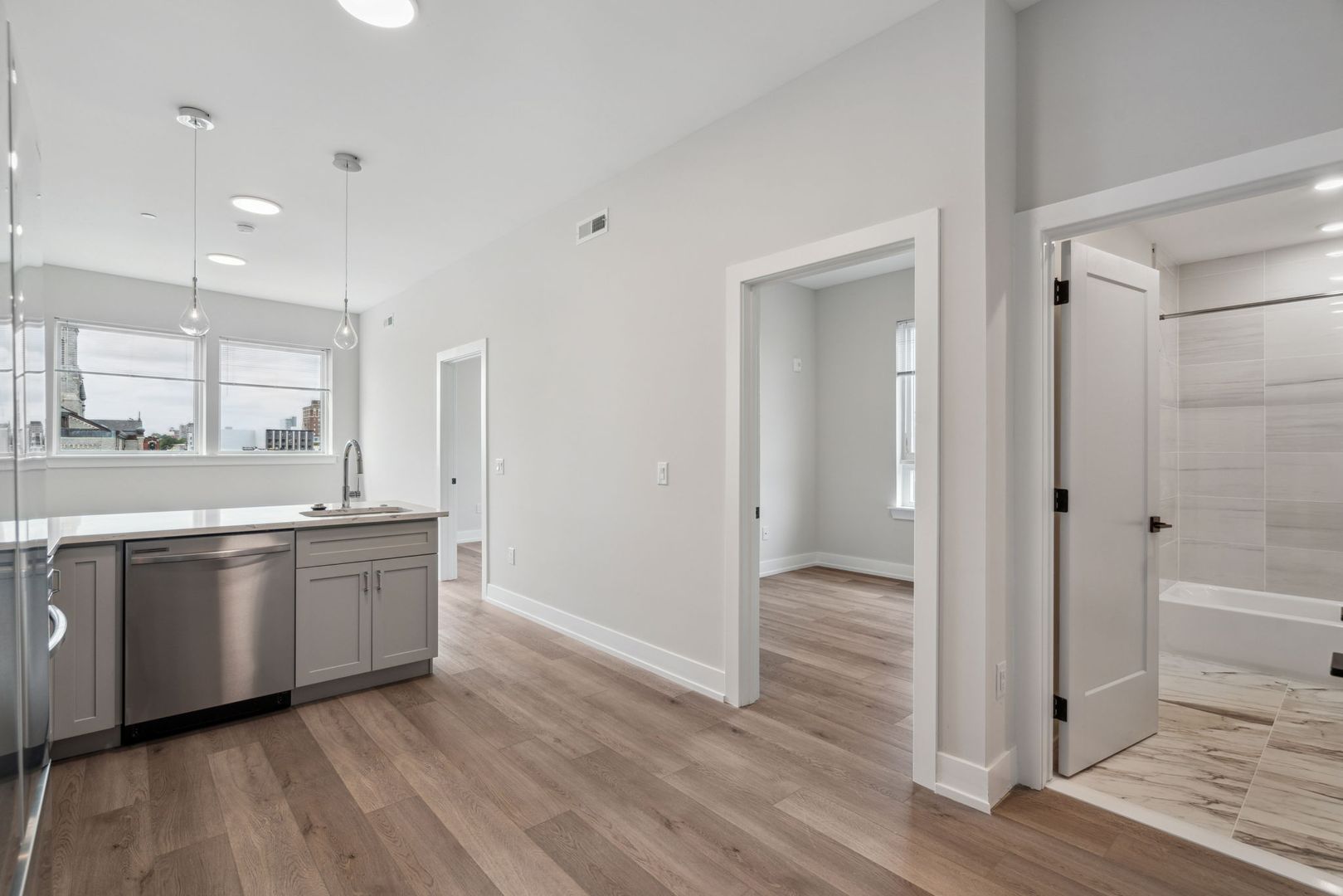 Our 1 and 2 bedroom units boast large windows filling your space with natural light, creating a bright and homey atmosphere. Our kitchen features a full stainless steel appliance package, sleek cabinetry and quartz countertops that create a refined look– fit for any level of chef. The Dally offers plenty of amenity and common spaces to hang with your friends, including a recreation room, furnished roof deck, and fitness center.